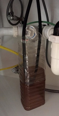 Oh, funkycamper -- my first clip! :) But, wait, there's more...bonus pic of the ugly-but-practical gizmo! Correction: one apple juice bottle plus one cranberry juice, shoved together (don't even need tape for this little project). Just buy generic juices -- the store brand tends to package them all in the same shaped bottles. Sits neatly at the cabinet bottom and has a very slender profile.