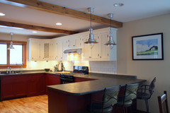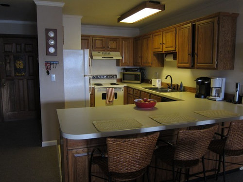 Lighting - just like GreenDesigns suggested. Maybe pendants too.The linoleum floor is also an issue -- but I'm not counting that cost right now. The whole unit needs need flooring. I'm leaning towards tile that looks like wood, but worried about it being cold. We are only here weekends so in floor heat probably not viable. Also ski boots on tile = noisy. Wondering about wood-look vinyl but wondering if it just looks awful tacky.