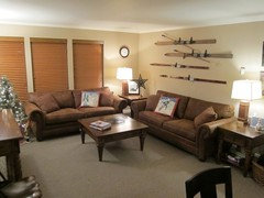 {{gwi:2141788}}In this room, all the furniture is currently dark brown, so it was my goal to mix that up. The couches are the most expensive item here to replace, so those were staying from the get-go. I just looked at replacing tables (side, coffee, console), which can be done cheaply. (I didn't end up replacing them all.) I kept the lamps, skis, and window treatments.