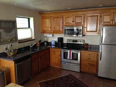 4) Stainless appliances to reflect light and because a bit of metallic looks nice in rustic design. I notice most cabin/lodge kitchens have stainless steel, probably for that reason.