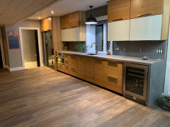 Contrast or complement textures, tones and more by using a mix of materials for countertops and island tops