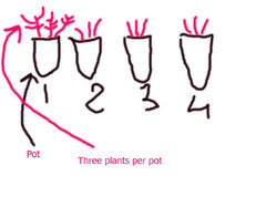 For example, you can see circle number 4. This is a pot with 3 plants. I will use for this pot mix number 4. Every pot will have different mix. We want to find the best mix.