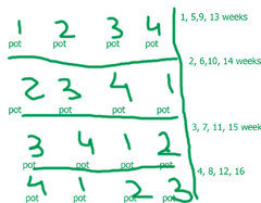 Each circle is still one pot with one plant. This time, there's only one column of plants, all equally distant from the window. Each group of three plants is a kind of soil - blue might be 5:1:1, yellow might be potting soil, etc. This removes light as a factor, but give you more data points for the conditions you're trying to test. If one plant in group 3 fails, but the other two thrive, you might chalk it up to disease or a genetic mutation. But if they all fail, it might indicate the kind of soil is to blame.dert17 thanked katlandreth - 10 years ago