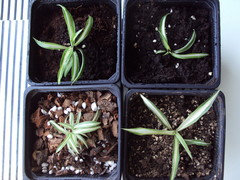 Splitting the plants up into their own pots and arranging them like this, without moving them, will let you know if a plant was successful because it had more or less light, or if it was more likely due to the mix. In other words, you could compare a plant grown in 5:1:1 mix and low light to a plant in potting soil and low light and not have to guess if the difference was due to light since they should be getting basically the same light as each other.
