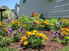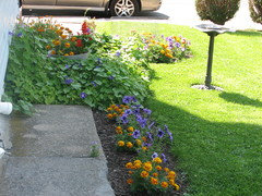 This area is where I have our puny Cherry Tomato plant and I just threw some Marigolds in there... NEXT year Carefree Celebration Rose Bush will be planted right where that birdbath is now... Then other types of plants will be planted in front of CC...
