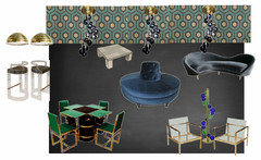 I went a little more early eighties. I would put in dark hardwoods, and paint the walls a dark, almost black color. I'd put the Hicks Hexagon wallpaper on the ceiling, in between the beams. I would paint the beams the same color as the walls, or possibly mirror them. I would redo the channel-tufted window seats in a teal velvet, and put mirrored coffee tables in front of them. I'd redo the bar in black lacquer and brass, with these brass pendants and lucite barstools.