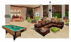 This DAT was particularly open-ended. The exterior of the house is Brutalist but the interior architecture was traditional, and the furnishings were institutional. "Design any room in this house" didn't exactly narrow the choices. I latched onto the era of the house rather than the style of the house (I find it hard to do Brutalist interiors well because they are more about architecture, space and light than they are about your choice of furnishings). Hence the green, orange, and brown, which I would probably not choose for myself, at least the orange. (Although that color palette was probably more late 60s/early 70s. By 1978, designers had probably moved on to the color palettes I remember from the 80s.) I also wanted to make the house more of a family home, and that meant less formal, in reaction to the institutional furnishings. Overstuffed sectional for TV viewing, pool table, etc. When I was a kid, I envied my friends with the basement family room with the foosball table.