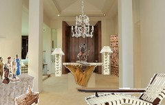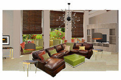 crl_ I couldn't quite make up my mind about the room. It's "staged" with white plastic patio chairs, so I figured that the stuff has to be able to stand up to some water, but it also looked like people use the room to sit at tables. The rug is an indoor-outdoor rug, and it would be easy to do the rattan sofa in an outdoor fabric. The other furniture should be fairly robust.I think we are all doing the 70s thing because it's new and different and because the other architectural cues are pretty weird. But don't worry I'll try and do a Marian extravaganza next.
