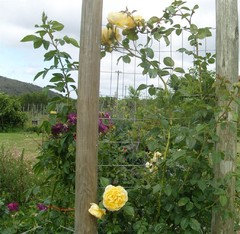 we had really great rains yesterday and apparently it's snowing - again - in the Lesotho mountains. so it feels like winter, but next week the temp will rise to 100,4 F (38 C). the trellis is going to be extended...for Rhapsody in Blue (on the left) and more space as well for GT.