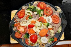 " Beef and vegetables marinated in olive oil, garlic paste, lemon juice, cumin seed powder and red chilies. A layer of marinated vegetables, then beef pieces and again a topping of marinated vegetables. Bake for 50 mins at 180*C or 356 F. Yogurt can be used. I see sliced tomatoes, onions, broccoli.