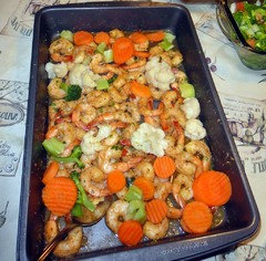 That's the same veggies combo we use in oriental stir-fry: We use garlic, onion, tomato, broccoli with beef. And we use cauliflower, celery, carrot & lime for shrimp. Except Oriental stir-fry is a pain to stir, and oven-roast is much easier. My kid doesn't like the crunchy veggies in stir-fry, so oven-roast would make veggies more tender.