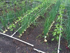 Sometime in April, I'll but the pepper transplants in the ground, ofter interplanting them with onions. (More on that in a second.) Also in April, still in their own beds separate from the cool-season crops, I'll plant cucumbers and a succession crop of bush beans about 3-4 weeks after I put the first beans in the ground. The timing depends on soil and air temperatures more than on any calendar date, so I keep my soil thermometer handy and keep an eye on the forecast. By this time, I sometimes have the earliest summer squash plants in the ground. This is primarily to give them a chance to flower and make squash before the squash vine borers show up because once the SVBs show up, the summer squash plants (except for the Korea summer squashes) are living on borrowed time. They may not like the coolish nights but they survive them and produce. By this time, my front garden is filling up and space is getting tight, so I start squeezing things in.
