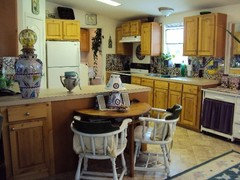 OK I took several kitchen pictures. The biggest remodel we did here was to re-face the crappy manufactured home cabinets with good Maple or Alder plywood and the front facings with knotty Alder to match the wood doors and drawer fronts the house came with. ALL the cabinets were to be real wood but there was a screw up when writing up the contract. GGGRRR