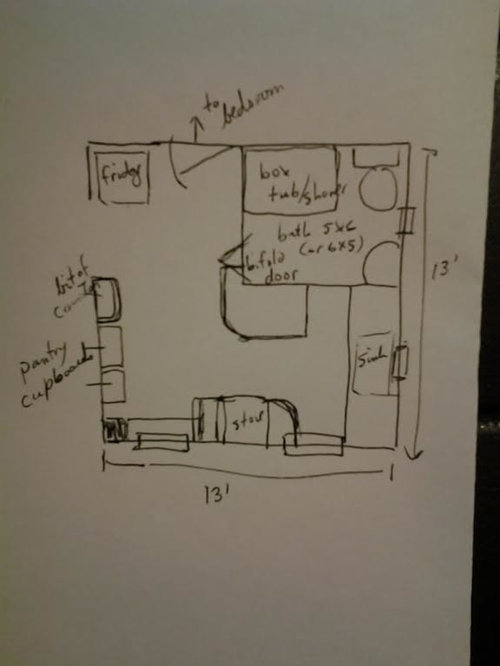 here's a map of the room... thanks for the advice on apps, but duh, yes, drawing and photographing works well too. Up by the fridge there are three doors, to the bathroom, the bedroom and a wide cutout to the main house. The ceiling is vaulted, leaving a flat deck over the bathroom, which could be used for storage, but mainly houses a large herd of dust bunnies and one blue ceramic pig.