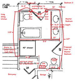 Bathroom layout idea with 2 small bathrooms - including measurements