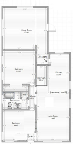 YES I've been trying to explain that for awhile now - I am seriously considering taking out the walls by the steps. It's a corner wall so my GC was concerned it carries some load, but removing them would open up the kitchen so much more! I'm talking about removing the red: