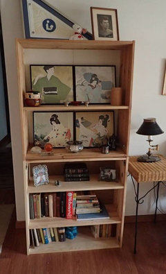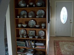 I'm not sure what will bring about a revival of the taste for Chinoiserie or even Victorian or antique anything. Folks are more transient nowdays and aren't as inclined to devote themselves to a set aesthetic in their homes. They want a flexible look. So I think individual pieces of Chinoiserie will always be popular, like art, dishes, fabrics and accent furniture. I think the total look will remain popular with only a few folks who can afford it. Because of the transience, I am afraid the days of those gorgeous Chinoiserie influence wallpapers are gone forever, at least in big common spaces in homes. While I love the look, even I myself would not go for it, because I would want to be able to more easily change out the look of a room from season to season or year to year. But I have little vignettes of Japonisme all around my current home. When I have some time, I may post some of them. Here's a quickie, just something I totally threw together. The framed pictures are very old calendar pics that my mom had from back in the 50's in SF. They are just there right now to fill up the space and hide the very ugly white back of the shelving units. They will go on the wall eventually, and my mom's collection of Japanese dolls will go in the unit when I get it properly set up and the glass doors installed.