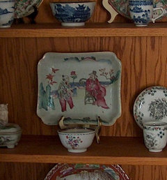 This rectangular plate is made for the Chinese market, complete with authentic dynasty seal on the bottom, but it is rather colorful. The three blue and white pieces above it are all 18th century export pieces as is the rather elegant gray and white cup and saucer set to the right of the square Chinese plate.