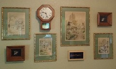 Here's some more of the "Japonisme" art of my mom's. The hideous faux bamboo frames and pea green matting was something an interior decorator convinced her to do in the late 80's. The original frames were black, with ecru matting. The silver pins are Thai, and the little dolls part of her Japanese doll collection. The pictures came from Japan, but I read up on them and they were done for the tourist trade. i still love them though. No artist is listed on them. She has other more refined pieces, like lacquer ware that my friend from Japan says you can't even get anymore and some gorgeous wood block prints. Fans, fabrics, china pieces, ivory carvings, even a silver sake set. She had it all shipped back in tea boxes, which are probably somewhat valuable too. I loved all those pieces as a little girl, so will be keeping them. Starting to cry just thinking about it.