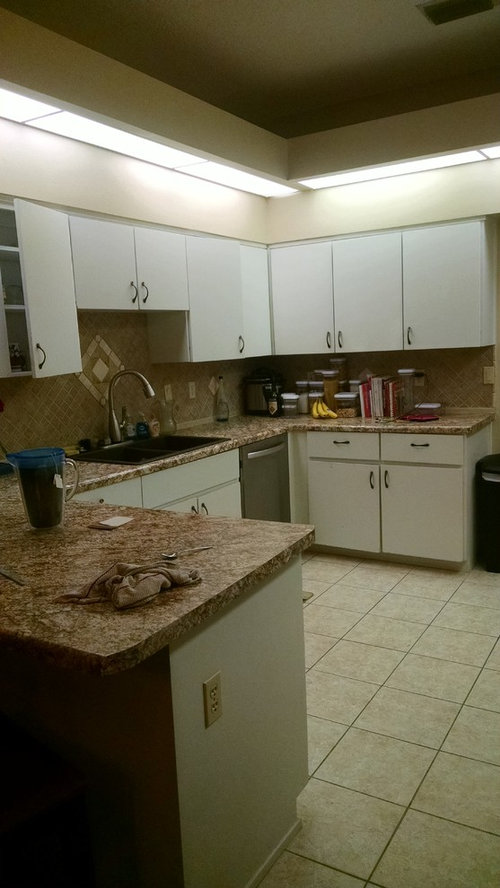 See how you can update a kitchen with new countertops, light fixtures, paint and hardware