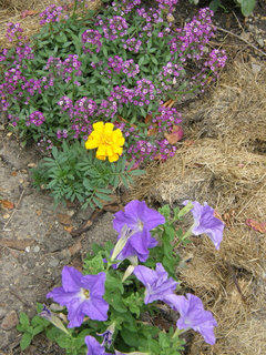 Below is alyssum and blue petunia. When I used to get horse manure (high in phosphorus), the same alyssum turned burgundy red (phosphorus shift blooms to the red zone). Now I put red-lava-rock (high in potassium), and that shift blooms to the blue zone: really blue petunias and more blue alyssum.