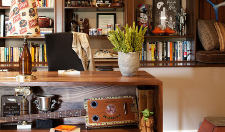 Raw storage space in a Hollywood writer's home is transformed into a masculine home office hybrid