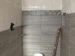 artemis_ma, I love the log cabin look in your home, and the cabinet doors in your bathroom. Is the exterior logs too? What is your shower fixture? I really like it. Our shower will also be accessible but I am having trouble finding a shower fixture that is adjustable height AND the shower head angles toward the bather, not down.