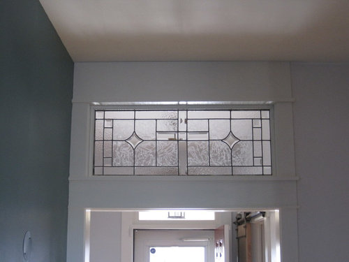 For the newbies- I reintroduce myself from time to time. I built my own home, and enjoy the process so much that I still hang around here. Like many big projects, it will likely never be truly 'done', as I'm still finishing some things, and starting new projects. A couple days ago, I fitted another piece to the puzzle that was planned from the very beginning. I created a transition from the small foyer to the main hall, and built a transom over it. A friend of mine is a stained glass artist, and made this panel for us, based on one in the old country church we attend. I liked the simple lines and clean look.