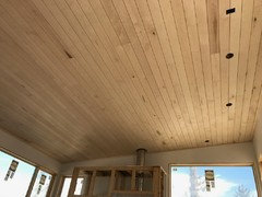 Finish work is underway. Drywall is painted, they just finished the maple ceiling in the main living space and have started on the hardwood flooring. Cabinets should go in next week.