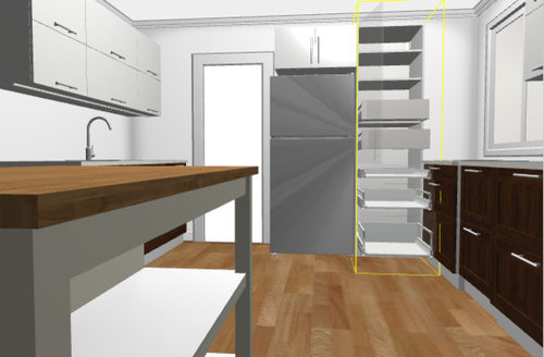 I am going with Ikea boxes, probably with semi-custom doors with 2" lighting valances and side slabs for exposed sides and around the fridge (waiting