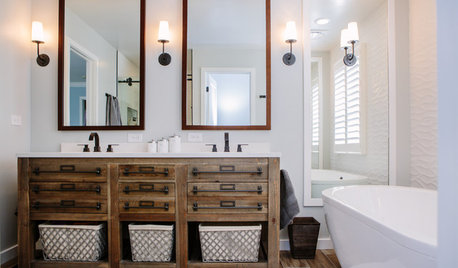 Rustic wood tones, rich colors and floating units show up in the top bathroom photos. Which looks do you like best?