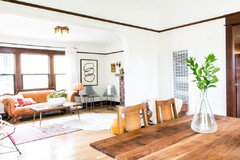 Decorating modern farmhouse when stuck with wood colored trim