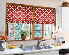 Two-tone cabinets, vibrant fabric and a frosty backsplash brighten this eat-in kitchen