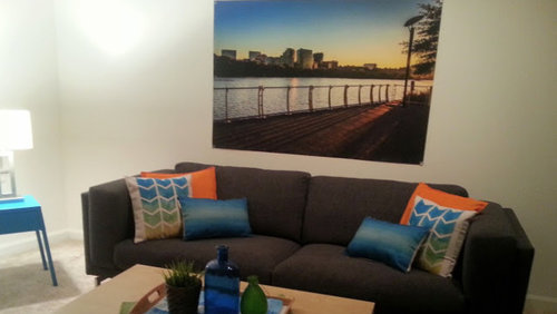 Mid century mod decor with contemporary gray floor & espresso kitchen?