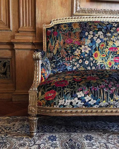 Vintage and reproduction grain sack material creates thick, durable upholstery for sofas, chairs, pillows and more