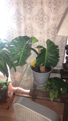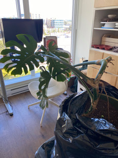 Hi Russ! I have acquired the bottom three leaves / nodes (with intact root system) of a large Monstera plant. The rest of the plant has been pruned away. There's also a little baby shoot coming out separate from the main plant.