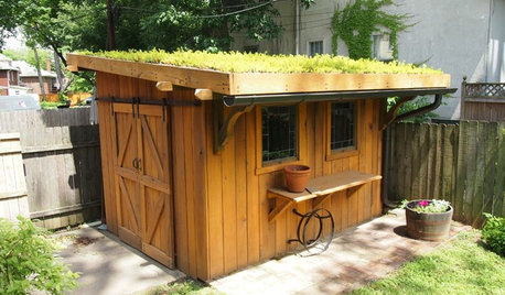 Sedums help prevent runoff and add a green touch to this charming backyard building