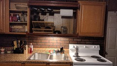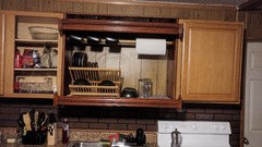 - 7 years agoI turned the dish drainer into a centerpiece. Its a rental and we needed cabinet and counter space, so we built this (it hangs there, not permanently bolted to anything). Dishes stay in the drainer on display! ((and yeah, cabinet door was missing when we moved in ... its cheap until we can build our own place))