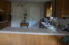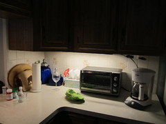 We were out and about most of the day and went out to eat so it's looked like this all day. You can see there's one piece of mail on the counter we still need to handle before bed. Our mail comes late in the day -- we've already tossed the junk mail. You can't see from this angle, there are a few dirty dishes in the sink that'll be put away before bedtime, along with the wine glass I'm drinking from right now. I'm pretty good at putting my dirty dishes in the DW immediately throughout the day. Hubby, not so much.