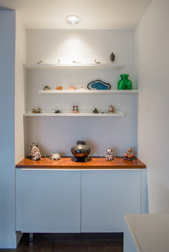 Hollybar's idea for doors on the lower cabinets is excellent. If that is not in the budget, or until you make that happen, you can easily change the look by more carefully placing the objects on your shelves. Because you are going for a very staged look, I would move the books on the shelves to another room in the house, except for the larger books that are laying flat. Place one object on each shelf and play around with the balance. If you have any other objects that are blue or have saturated color, bring them in here.