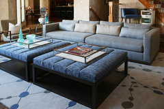 Ingrid, I do like the coffee tables in those pictures and am wondering if a glass and metal or an acrylic with wood is the way to go. Certainly addresses the issue of too much visual weight bunched together. But then I also wonder if once we better utilize the space and buy the right AND right size rug, maybe a substantial coffee table will work. There are no walls separating rooms in the front of our home (living room, dining room and kitchen) and the LR/DR is about 40" long and 18" wide but one of the two sofas will stay positioned for TV viewing. However, I can certainly see adding a great modern chair and moving the sofa down to enlarge the room. I'm envisioning either a large rectangular abstract behind the sofa or the two large papyrus pieces I referenced in the link above. I agree, I don't see a white rug in this room and really appreciate the input about dimensions of rug border to wood floor. If you're able, I'd love to see some examples of warm transitional rugs you feel would work. And thanks again for all your time and thoughtful remarks!