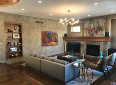Hollybar: You hit the nail on the head! The scale is soooo off with that rug. Looks like I'm trying to squeeze 2 elephants onto a postage stamp. I like your Stark rug suggestion in part, because I didn't totally miss the mark when it comes to the rug's design, which is a subtle animal print (giraffe I believe.) I hope it will look good in the bedroom because that's its next stop. Re: resurfacing the fireplace and the "inspo" pics -- which photos did you see a fireplace in? Can you provide more about what you're thinking for the fireplace cuz I can't seem to find what you're talking about. I also like the "doors on the lower bookcase shelves" suggestion and will definitely get that done. I appreciate your candor about the coffee table and this in particular is most upsetting. It is a recent purchase selected by my husband. My gut said no but because I solely took the reigns in decorating our last home I wanted him to have more say. But it is a huge regret for me and a lesson well-learned. The visual weight of that coffee table in front of two dark, heavy sofas will never achieve the look I desire. Dare I admit the darn thing isn't even 6 months old! I WOULD LOVE TO HEAR COFFEE TABLE SUGGESTIONS FROM ANY AND ALL HOUZZERS. My thoughts are something contemporary. I'm also with you about the behind-the-sofa art. The round mirror was to be centered among an Architectural Prints Gallery (not meant to be a stand-alone piece) that I used in my last home. At this point, I'm leaning towards a large ,monochromatic abstract for behind the sofa but HOUZZERS, I welcome your thoughts and suggestions.