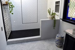Playing with stripes, angles, tones and more can add drama to your shower enclosure