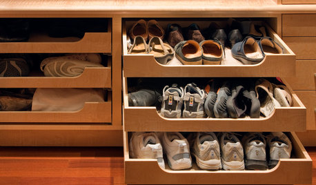 Built-in organizers, wall-mounted shoe racks and a pull-down rod help corral these wardrobes