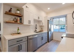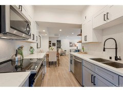 The pictures below are that of a kitchen of a unit in my building that was flipped recently. It sold about one week after listing for $200,000 more than what the flipper paid and the purchase price was as much as nicely remodeled - albeit not quite so trendy - units in my building sold for within the same time period. It is on a low floor and has a view of a parking lot. Since I live in a high rise, upper floors with unobstructed views are way more desirable. However, it has every element of what is currently trendy - I don't have any way of judging the quality of the cabinets or appliances but I assume they are not the premium brands that a sophisticated homeowner might purchase for their quality rather than for just being stainless :-) - Shaker doors - check; gray - check; open shelves - check; waterfall counter - check check LOL