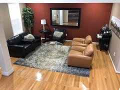Area rug suggestions for camel leather and brown leather mix