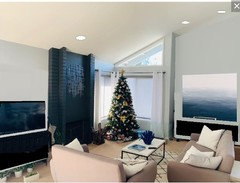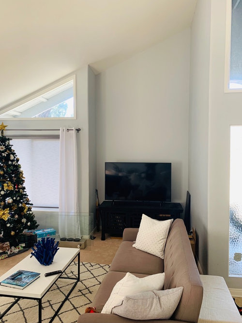 White surfaces and Scandinavian midcentury modern-inspired decor freshen up a once-dark living space