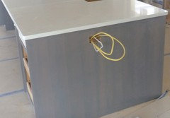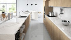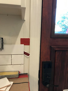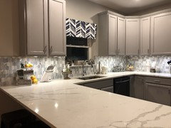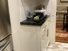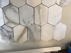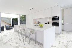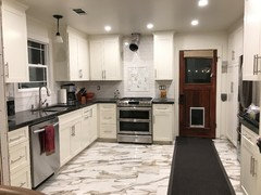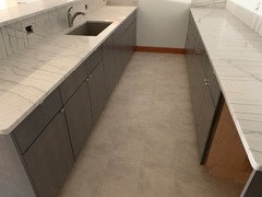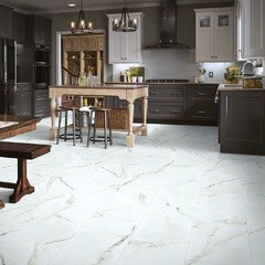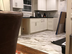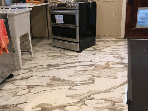 Installed a Calcutta oro porcelain tile for our new kitchen floor.