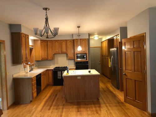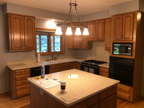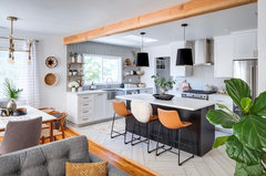 incorporating Oak trim in renovation white transitional kitchen