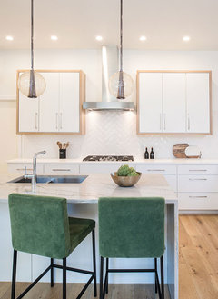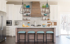 Exposed shelves, open floor plans and simple materials make these kitchens light and airy